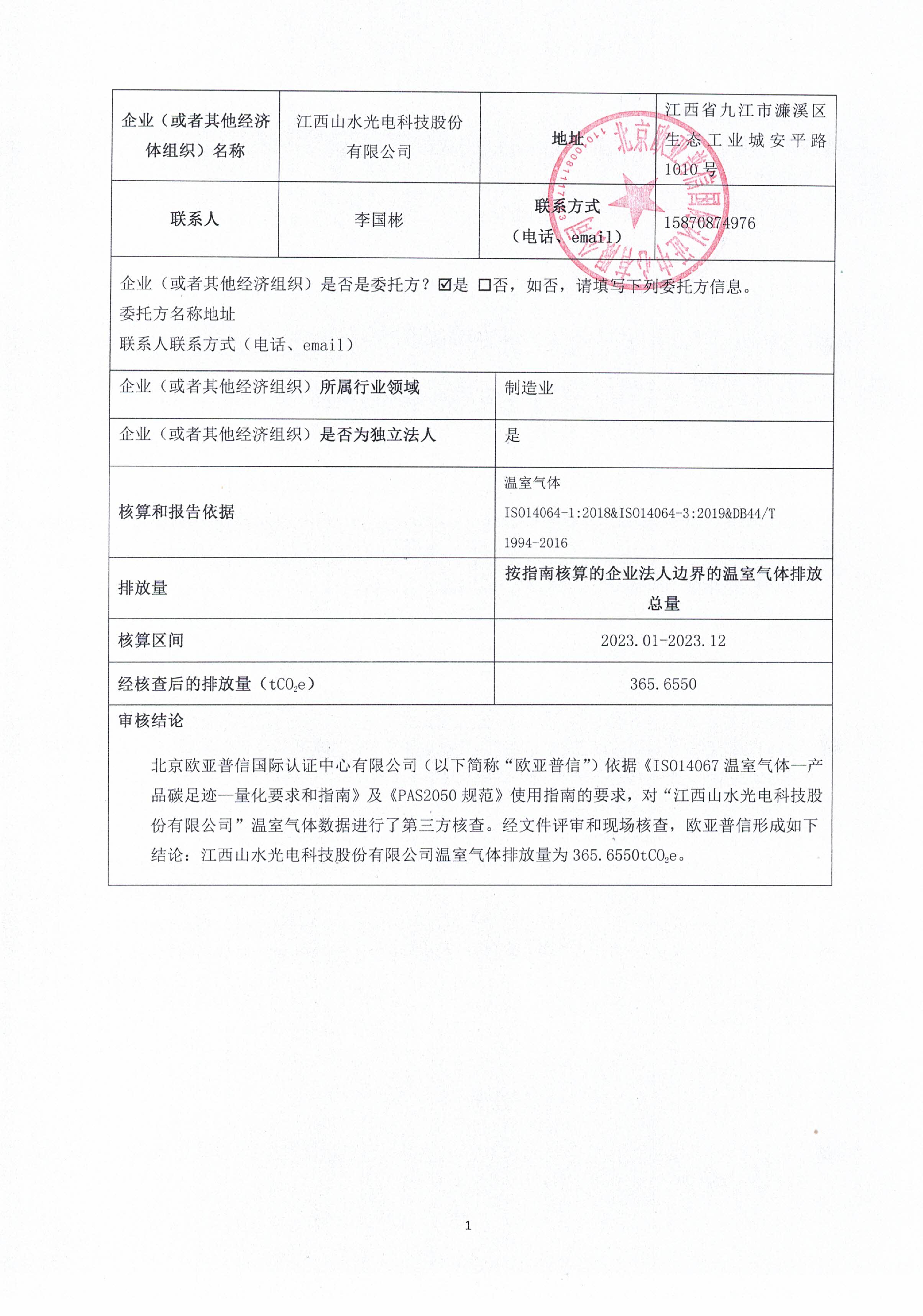 江西山水光電科技股份有限公司2023年度溫室氣體已通過北京歐亞普信國際認證中心核查并認證,相關證書和報告如下: